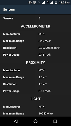 : รายงานข้อมูลเกี่ยวกับเซ็นเซอร์เช่น accelerometer และ magnetometer รวมถึงช่วงการใช้งานความละเอียดและการใช้พลังงาน