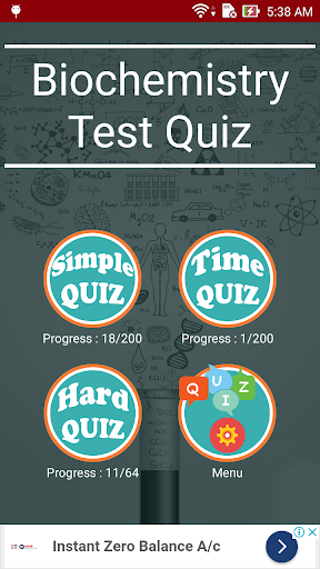 Using this Biochemistry Test Quiz game learn, spend some free time with it, have fun playing it. It has 3 types which is simple quiz, time quiz and hard quiz.