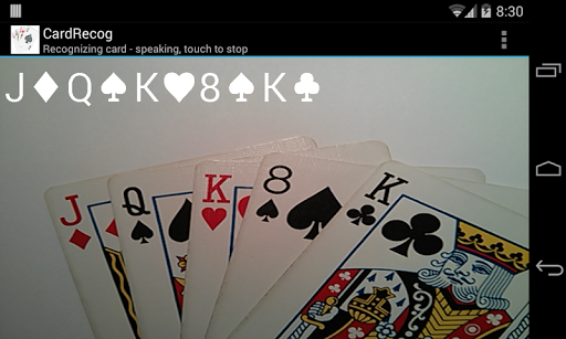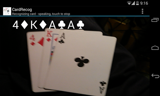 CardRecog is an app that recognizes playing cards from a standard deck. There are five modes that can be chosen in the settings; multiple, single, update, pre-flop and raw. You touch the screen to start recognition, hold the camera still, put some cards in front, and wait. You stay in recognition mode until you touch the screen again to return to idle mode. Once recognition occurs the recognized cards are displayed and sometimes spoken.