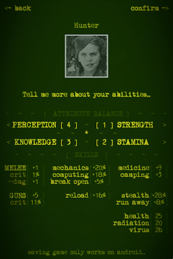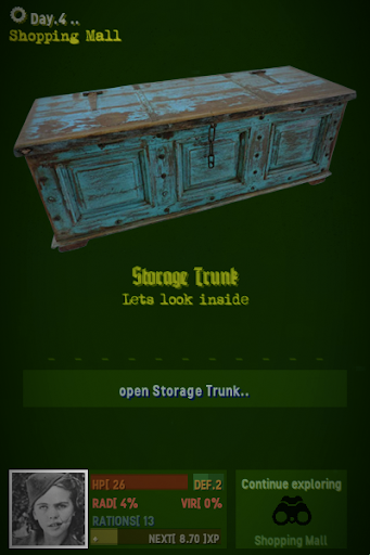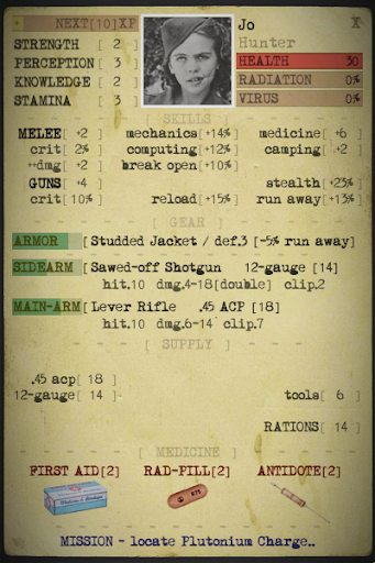 - มีชีวิตอยู่โดยติดตามความหิวของตัวละครของคุณ .. สุขภาพ .. รังสี ระดับ .. ความเจ็บป่วยของไวรัส .. อุปกรณ์เอาชีวิตรอด ..