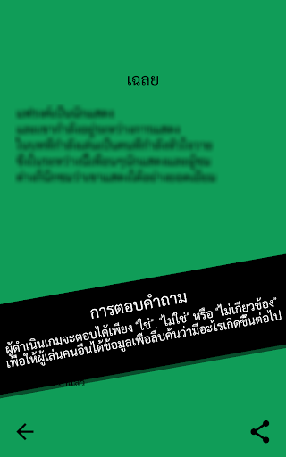 เมื่อเขาหรือเธออ่านเฉลยแล้ว จะไม่บอกคนอื่นๆโดยตรง แต่ผู้เล่นที่เหลือจะต้องตั้งคำถามแบบใช่หรือไม่เพื่อทำการไขปริศนา