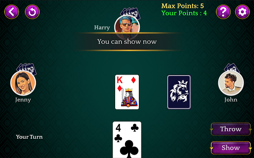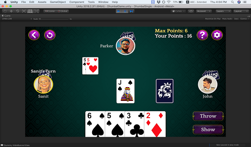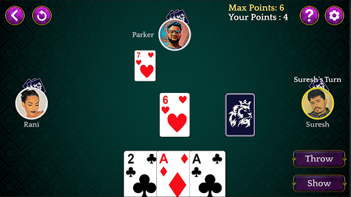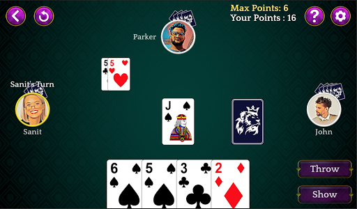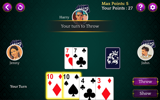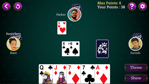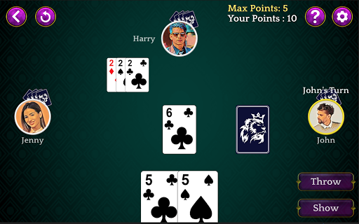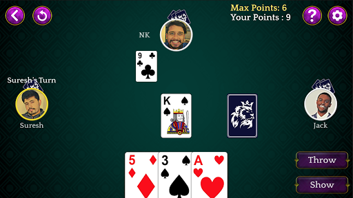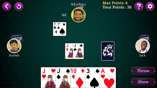 Dhumbal is a fun game played between 2 to 5 players with 5 cards distributed to each. The objective of this game is to have lowest points among the players. You can throw a single card at a time or multiple cards a time if cards are a set or a pure sequence.