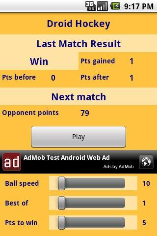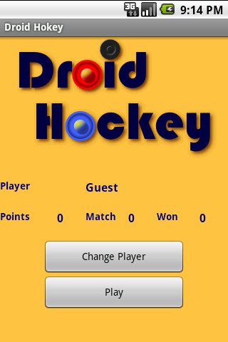 Droid hockey is an air Hockey simulator for android Save your current progression, and the progression of your friend, challenge win and earn points.We are still workin on improvement.From version 0.7.133From main screen you can press phone menu button and choose between standard controller or a new experimental controller that try to be a little more responsive.game always start with standard controller but choice is valid for all match done before exiting or switching back.From version 0.7.493Added pause, during a match you can pause it with menu button. At restart tapping on button or anywhere on screen the game wait about 3 seconds to really restart.