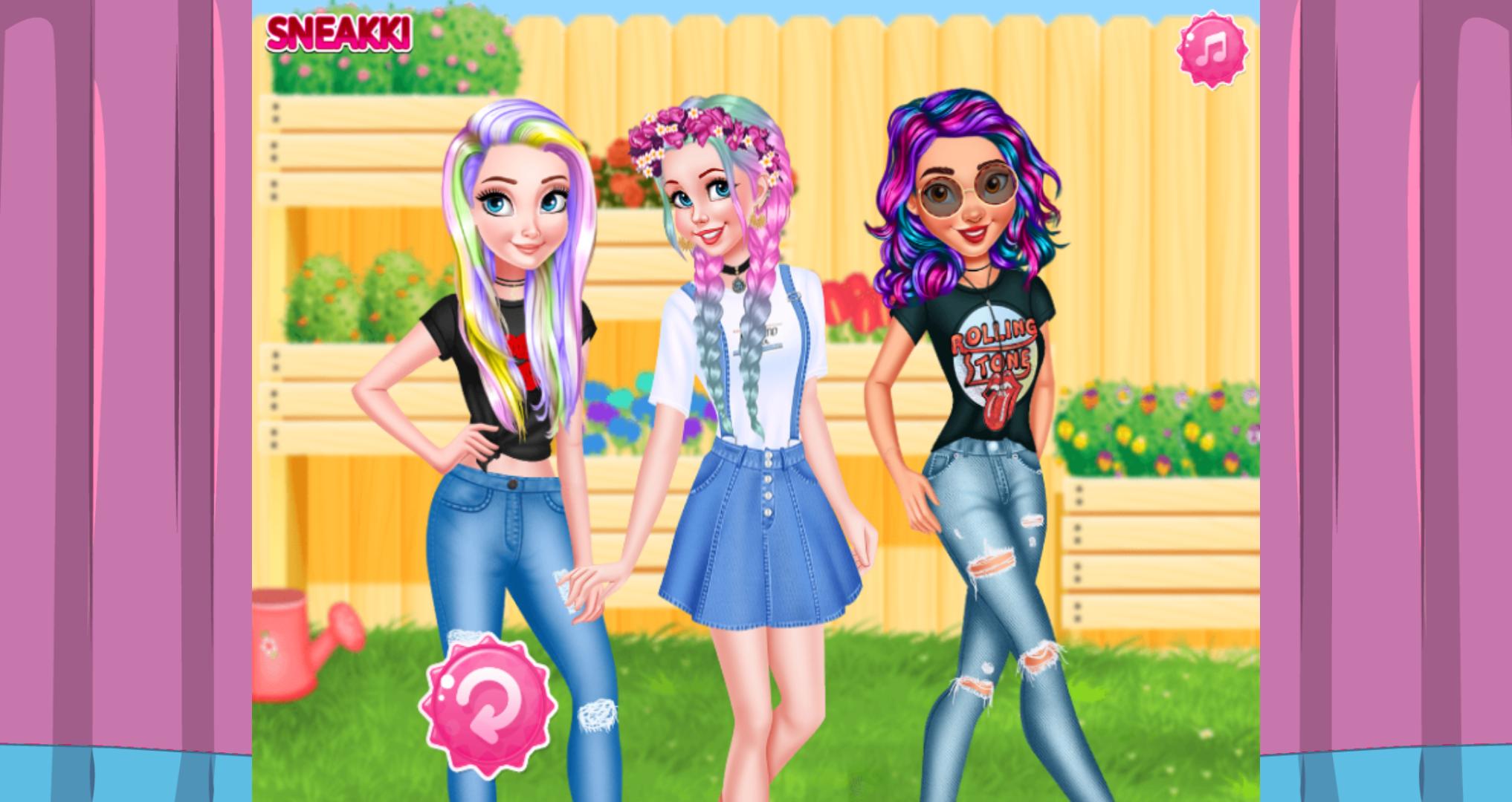 All three of them want a pastel hairstyle so start with princess who wants some braids and a cool makeup with dyeing hair salon. Decorate her hair with a flower crown and match her new look with a white boho style dress. The girls would like two buns and a very colorful hair and they also