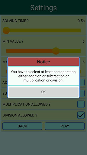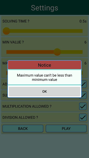คุณสามารถกำหนดค่าสูงสุด คุณจะมีตัวเลือกให้เลือกการทำงานในโหมดฝึกซ้อม ตัวอย่างเช่นบางคนสามารถเลือกที่จะเล่นเพียงแค่เพิ่มสมการจากค่าหนึ่งถึงห้าเพียงอย่างเดียวและเลือก 3 วินาทีตามเวลาขั้นต่ำในการแก้ไขสมการแต่ละรายการ