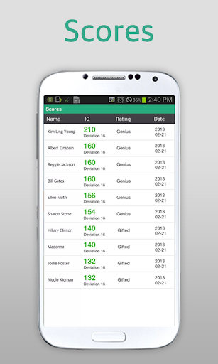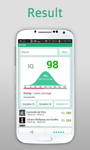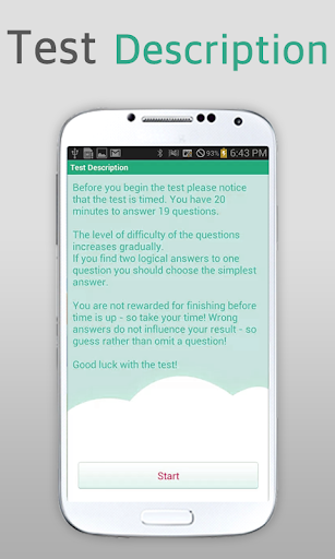 การทดสอบ IQ ได้รับการออกแบบมาเพื่อทดสอบ IQ ของผู้คนทดสอบ IQ ของคุณและเปรียบเทียบคะแนนของคุณกับคุณเพื่อน ๆ !มีตัวเลือกการทดสอบสองรายการ40 นาทีในการตอบคำถาม 39 ข้อหรือ 20 นาทีเพื่อตอบคำถาม 19 ข้อการทดสอบ - คำถามจะขึ้นอยู่กับกราฟิกตรรกะการทดสอบ IQ นี้ช่วยลดตัวแปรทางวัฒนธรรมเช่นภาษาและทักษะทางคณิตศาสตร์ความรู้ในอดีตและองค์ประกอบดังกล่าวนี่คือแอปทดสอบ IQ ที่ครอบคลุมที่สุดที่มีอยู่ใน Android Market!