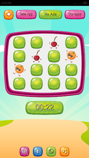 การเล่นเกมการ์ดหน่วยความจำนี้กับเด็กวัยหัดเดินของคุณจะช่วยให้พวกเขาปรับปรุงการรับรู้ปรับปรุงหน่วยความจำจดจำการ์ดและปรับปรุงความเข้มข้นของเด็ก ๆ ในขณะที่สนุกอินเทอร์เฟซที่เรียบง่ายและใช้งานง่ายซึ่งใช้งานง่ายและเล่นง่ายออกแบบมาเป็นพิเศษสำหรับเด็กการจับคู่ผลไม้และผักที่เข้าคู่หรือแฟลชการ์ดที่ตรงกันเป็นเกมสมองที่แท้จริงสำหรับเด็กและความสนุกสนาน