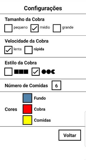 สามารถกำหนดค่าได้อย่างเต็มที่: ขนาดภาพวาด, ความเร็วงู, สไตล์งู (สี่เหลี่ยมหรือรอบกับแอปเปิ้ล), จำนวนอาหาร (จากหนึ่งถึงหก) และพื้นหลัง, งูและสีอาหารคุณเลือกการตั้งค่าของขนาดความเร็วและสีที่ทำงานได้ดีที่สุดในอุปกรณ์ของคุณ
