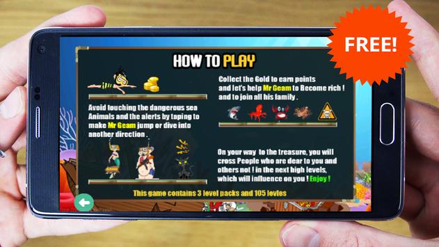 Your inicial MISSION is to help Mr Geam to collect as many Gold (Treasure ) as possible to get the Best Score . Avoid and Escape from the Danger Around him, since he is in the Jungle of the Angry Shark and other Sea Animals . the Mission wil be not Easy .