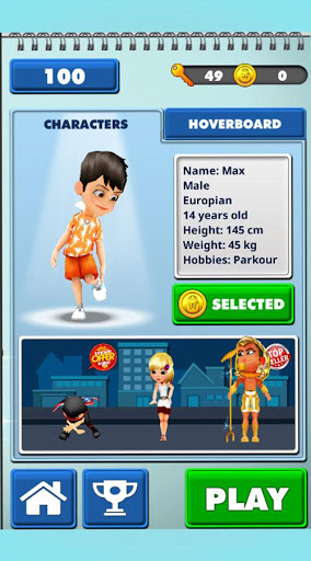 ในเกมวิ่งที่น่าตื่นเต้นนี้คุณสามารถเลือกระหว่าง 10 ตัวละครที่แตกต่างกันเพื่อเล่น