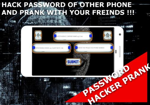 PASSWORD HACKER PRANK is a joke app which features the hilarious entertainment to hack your friends phone via asking friend's mobile name and model and mobile number details then this app play some random funny hacking animation to scare your friends