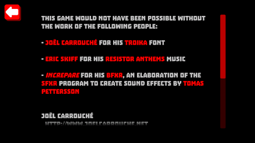 เกมนี้คงเป็นไปไม่ได้หากไม่มีงานของคนต่อไปนี้: JoëlCarriouchéสำหรับ Troika Font ของเขา Eric Skiff สำหรับเพลงริสเตอร์ตัวต้านทานเพลงและ increpare สำหรับ BFXR ของเขา (โปรแกรม SFXR อย่างประณีตเพื่อสร้างเอฟเฟกต์เสียงโดย Tomas Pettersson)