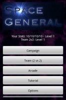 It is the year 2168 and you have the technology to command an entire star fleet from the palm of your hand. A single swipe on your Mobile Commander Device can send battle cruisers on conquest missions. Command strike-forces from multiple planets to squash your enemies. Your task is to eradicate the aliens from all planets in each of the solar systems in your galaxy. But, the aliens also have advanced technology. You must use strategy, trickery, and even luck to take on and destroy multiple alien races in each solar system. Each alien race has special traits including attack, defense, speed, and growth capabilities. As you endure each battle, you will increase your experience to improve your own military power. But be careful to not fall behind or you may be unable to conquer all 100 solar systems (levels) in this galaxy conquest game. Encounter four different alien races in this strategy game. Beware of the black hole. Good luck, Space General! How to Use: This game keeps your Android phone/tablet awake while it is running. When you stop playing, switch out of the game, exit the game, or turn off your mobile device manually. Main Menu: Campaign - There are 100 maps in the campaign. Select this option to play through the missions. You will be able to level up and improve your stats after each mission. Team (2 vs 2) - Play a random game of two on two. You team up with a computer player to battle two alien enemies. Arcade - Play a random game. Your stats and alien stats never changes. Custom Level - This choice will only show up if you unlock it by completing the campaign. This choice allows you to compete with modified stats. Tutorial - An online overview that shows you how to be a Space General and how to use the Mobile Commander Device (MCD). It's a highly recommended training program. Options - Allows you to change game settings. Reset Stats - Resets your campaign stats. Options: Alien Attack - Choose the alien strategies between 1) Random; 2) Nearest; and 3) Weakest. Hell Mode - Make the aliens twice as hard to beat. Speedy Mode - Speeds up the game play. Decrease Graphical Effects - May improve performance on some devices. But is generally unnecessary. Enable Sound - Turns sound effect on and off. Menu Options: Main Menu - Returns to the game's title screen. Share - Tell your family and friends about this app. About - Detailed information about this app, such as the version number. Quit - Shuts down the app completely.