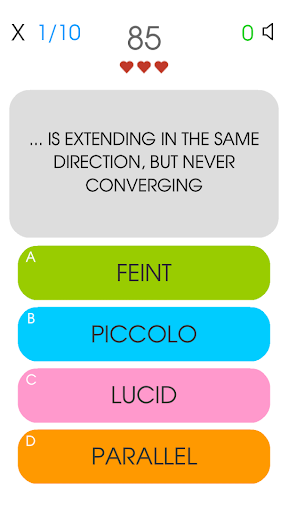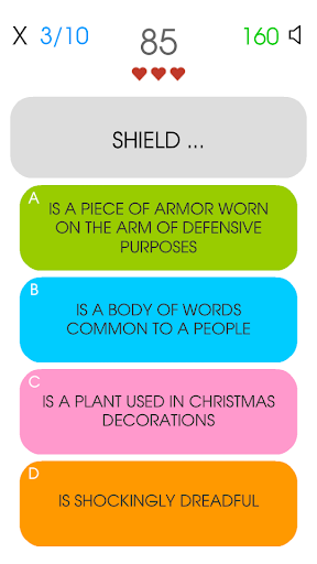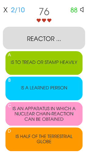 มี 2 โหมดเกม - "อธิบายคำ" บนหน้าจอหรือ "กำหนดคำจำกัดความ" เป็นหนึ่งในคำ มี 4 ตัวเลือกเลือกหนึ่งที่ถูกต้องเพียงหนึ่งถูกต้อง! คะแนนของคุณขึ้นอยู่กับความเร็วของคุณ รับคะแนนที่ดีที่สุดในการ จำกัด เวลา 10 รอบหรือ 120 วินาที ระวังคุณสามารถสร้างความผิดพลาดสูงสุด 3 มิฉะนั้นเกมของคุณจะจบลงแล้ว