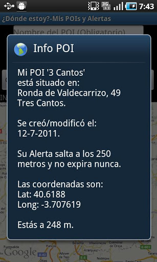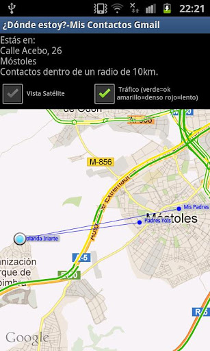 เวอร์ชั่นภาษาสเปน คุณสามารถรับภาษาอังกฤษ - รุ่นต่างประเทศ ("ฉันอยู่ที่ไหน") ในตลาดเครื่องมือที่มีประสิทธิภาพที่ช่วยให้คุณกำหนดตำแหน่งของคุณผู้ติดต่อของคุณจาก Gmail และ POI ที่สร้างขึ้นโดยคุณฟรี "ฉันอยู่ที่ไหน" มันจะค้นหาคุณบนแผนที่และยังระบุที่อยู่ทางไปรษณีย์ ข้อมูลนี้และข้อมูลเพิ่มเติม (เชื่อมโยงไปยังแผนที่ที่เรียบง่ายและมีรายละเอียดลิงค์เวลาลิงค์เพื่อดูภาพถ่ายจริงของถนน ฯลฯ ... ) สามารถแนบกับ SMS และ / หรืออีเมล