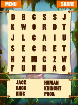The aim of the Word Search Secret is to find all hidden words. With word search puzzle game you can easily improve your vocabulary, concentration and spelling skills. Brush up your brain with this simple and addictive word search game and improve your English vocabulary.