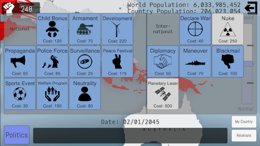เลือกหนึ่งในกว่า 50 ประเทศที่เกิดขึ้นจริงที่มีคุณลักษณะที่แตกต่างกันเช่นโครงสร้างพื้นฐานประชากรกองกำลังทหารหรือความมั่นคงและทำให้มันเป็นแรงที่โดดเด่นในโลก ปรับปรุงความสัมพันธ์แบล็กเมล์ผู้นำคนอื่น ๆ ประเทศศัตรู Nuke หรือพยายามต่อสู้กับการก่อการร้าย