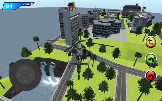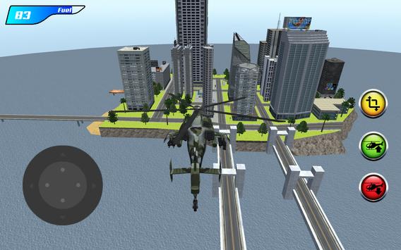 Fly on a powerful combat helicopter between the huge buildings and skyscrapers