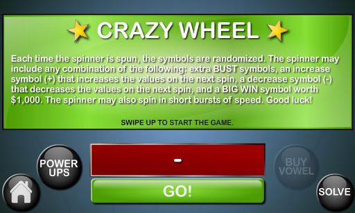 ฟีเจอร์ Crazy Wheel นั่น ... ล้อบ้า! ด้วยการหมุนแต่ละครั้งค่าสปินเนอร์เปลี่ยนและจัดเรียงใหม่เพื่อรวมสัญลักษณ์หน้าอกพิเศษเพิ่มสัญลักษณ์ (+) ที่เพิ่มค่าสปินเนอร์ในการหมุนครั้งต่อไปจะลดสัญลักษณ์ (-) ที่ลดค่าสปินเนอร์ในการหมุนครั้งต่อไป สัญลักษณ์มูลค่า $ 1,000 สำหรับจดหมายที่ถูกต้องแต่ละตัวปินเนอร์อาจหมุนได้ในระยะสั้นของความเร็ว! ใครจะรู้ว่าอะไรที่อาจเกิดขึ้น!