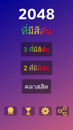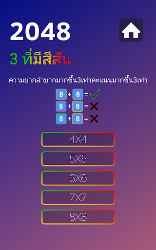 มีตัวเลือก 3 สีสัน 2 สีสันและคลาสสิกห้าระดับความยากรวมถึง 4x4, 5x5, 6x6, 7x7 และ 8x8 ใน 2048 สีสัน