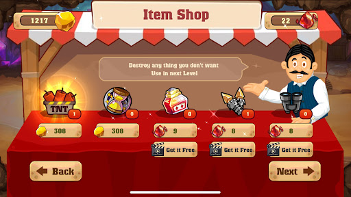 ทองคำไม่ใช่สิ่งเดียวที่ผู้เล่นสามารถรับด้วยข้อเหวี่ยงการขุดของพวกเขารายการอื่น ๆ รวมถึงหินกระดูกและเพชร ระหว่างระดับผู้เล่นสามารถเยี่ยมชมร้านค้าที่พวกเขาสามารถซื้อของเช่นไดนาไมต์เพื่อให้การขุดง่ายขึ้นและหนังสือที่ทำให้หินมีค่ามากขึ้น