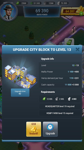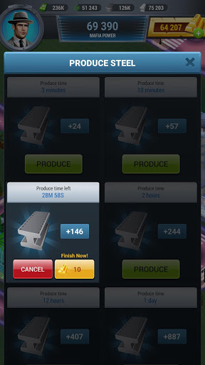 Your goal in Mafia World is to dominate the world of crime and mafia. Manage and expand your mafia empire by producing goods and participating in illegal activities to generate cash.