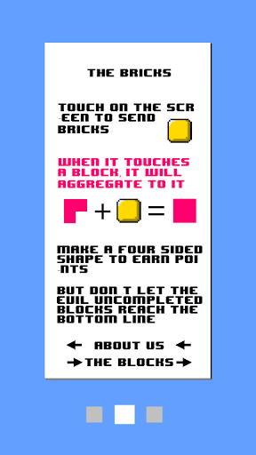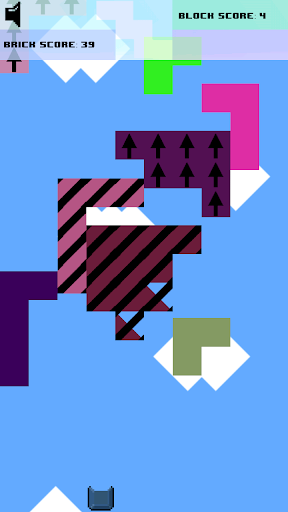You send bricks that will eventually become a member of a block... which MUST NOT reach you. You will need dexterity and pattern recognition to complete the all 36 first level of this 2D adventure. It feels like childhood again... build blocks with bricks, kind of a reverse Breakout game; build to better destroy.