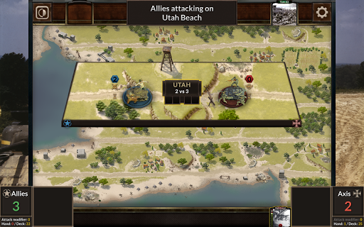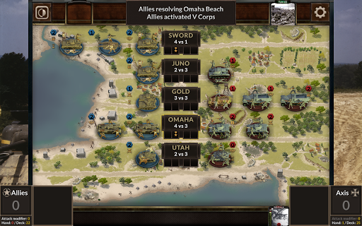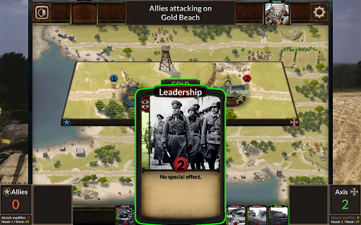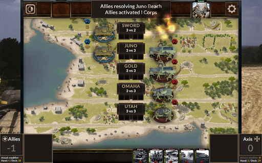 อย่างไรก็ตามแกนมีความได้เปรียบเริ่มต้น; พันธมิตรต้องหลีกเลี่ยงการถูกจับตายในน้ำ แม้ว่าหน่วยส่วนใหญ่จะจัดเตรียมไว้ที่ชายหาด แต่แต่ละเกมจะได้รับรางวัลหรือสูญหายไปตามตำแหน่งของการ์ดที่ให้กองกำลังเพิ่มเติมหรือการสนับสนุน ไม่เพียง แต่เป็นรัฐของแต่ละชายหาดที่สำคัญที่ต้องพิจารณาสำหรับการตัดสินใจเหล่านี้เท่านั้น แต่ยังรวมถึงภูมิศาสตร์ของแนวชายฝั่ง - หลังจากที่ชายหาดได้รับรางวัลกองกำลังชัยชนะสามารถขลุ่ยชายหาดที่อยู่ติดกันได้ ผู้เล่นทั้งสองต้องคิดล่วงหน้าเสมอมองหาวิธีที่จะใช้บัตรของพวกเขาลงในบรรทัด