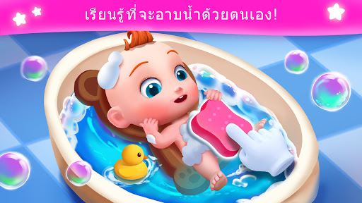 อย่าลืมช่วย JoJo แปรงฟันของเขา·หลังจากทานอาหารเพื่อรักษาฟันให้สะอาดด้วยนะ ได้เวลาอาบน้ำแล้วนะ ปรับอุณหภูมิน้ำ เติมน้ำลงในอ่าง แล้วใส่หมวกกันน้ำให้ JoJo เรามาอาบน้ำฟองสบู่ให้เขากัน!