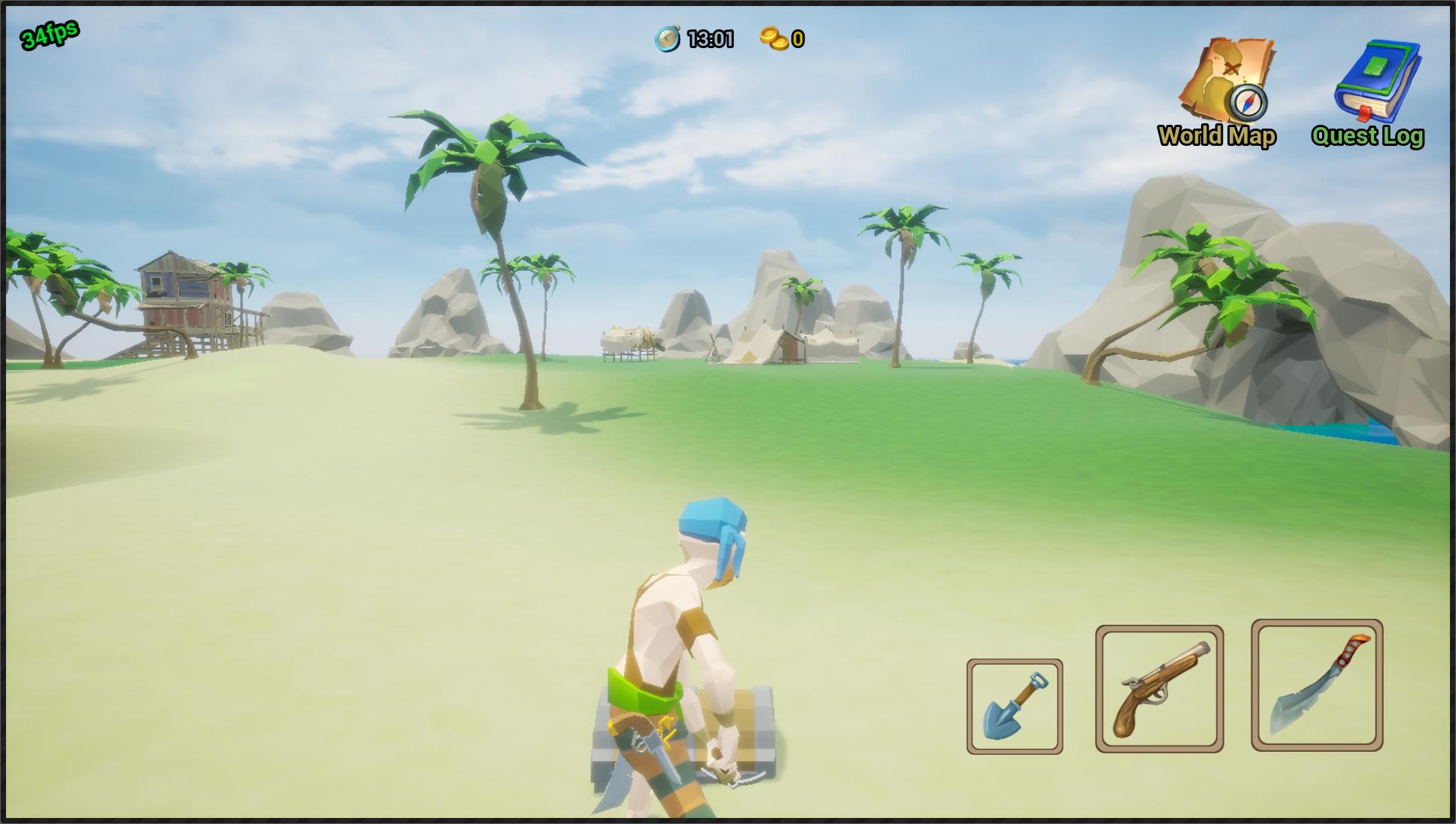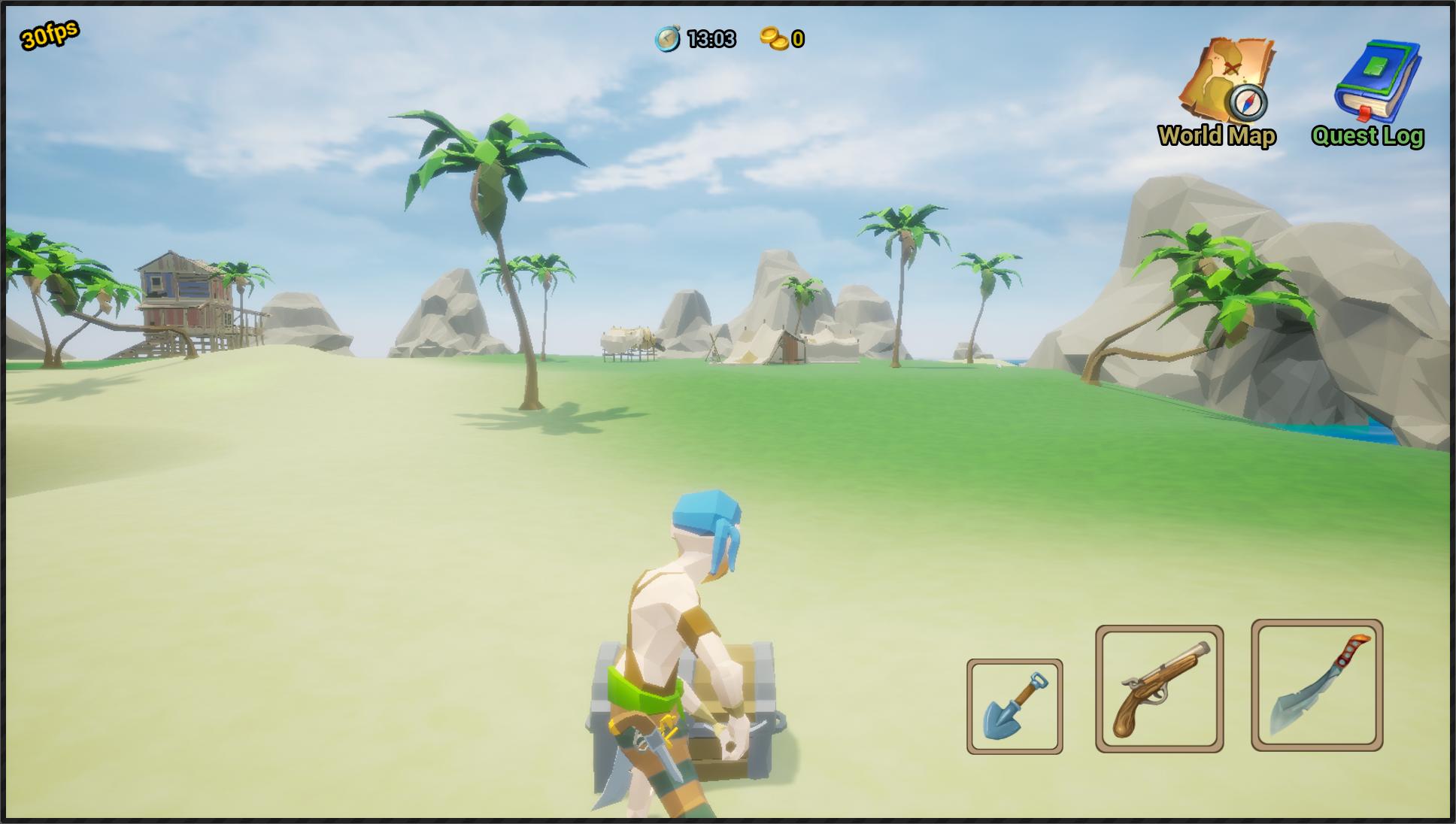 An offline single player, third person pirate adventure game in an open free roaming 3D world. With your sword, gun and shovel, you can hunt treasure chests, collect supplies, fight skeletons, go on various quests, sail ships and do battle at sea with ship to ship cannon fights.