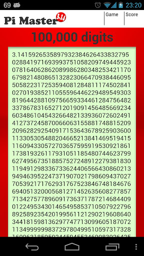 How many digits of pi do you remember? Record the number of digits that you have to memorize. Display 100 000 digits of pi. Known Issues - Slow work.
