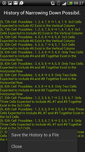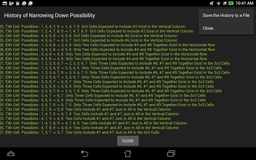 If you long tap outside of the puzzle in this level, "History of Narrowing Down Possibility" is shown and you can save it to a file.