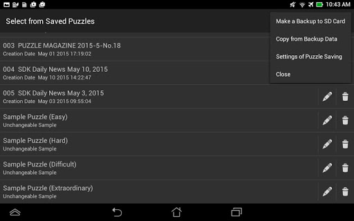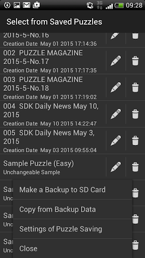 The progress of each puzzle is saved automatically, and there is no upper limit to the number of puzzles saved. The function to back up to SD card is provided. If you have too many puzzles, you can reduce them as you like.
