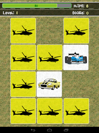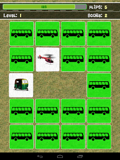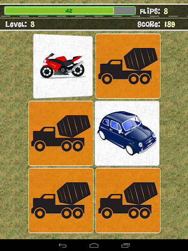 There is a number of cards hiding images of vehicles. Tap to see card's face. Only two cards can be rotated at once. Find pair of matching and they will gain score and disappear. Get bonus when you complete a puzzle. Remove all cards in time. Higher level - lower time. Save time - get score. No time - spend score. The most fun begins when little time available. The game lasts while you have time or score points. Get the top level you can!