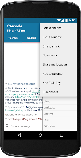 Note: Starting with AndroIRC 3.2, a new permission is required to get access to your location. This is *only* for the new action "Share my location" and nothing else! Moreover, AndroIRC *does not* have access to a precise position (given by GPS), but only to an approximate one (given by the network).