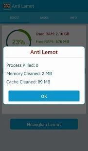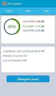 Aplikasi ini akan membantu untuk mempercepat Androidmu (speed booster) dengan membersihkan proses-proses, memory, serta cache yang tidak dibutuhkan (memory and RAM cleaner). Cocok untuk dipakai di semua tipe gadget Android, dengan user interface yang simpel dan sangat mudah digunakan. Cukup dengan satu klik dan biarkan Anti Lemot bekerja untuk membersihkan Androidmu!