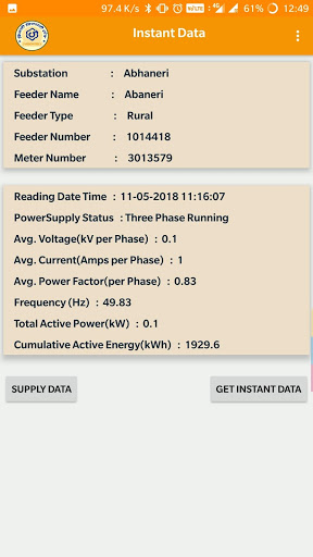 The app also have option to get the Instant parameters of the Feeder. In instant parameters, we can able to check the current status of the feeder i.e., Avg. Voltage(kV per Phase), Avg. Current (Amps per Phase), Avg. Power Factor(per Phase), Frequency(Hz), Total Active Power(kW), Maximum Demand(kW) and Cumulative Active Energy(kWh).