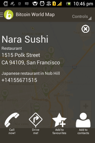 The user can also store a bitcoin accepting place in their favorites list, add it to their contacts, navigate to it or just call it without leaving the application.