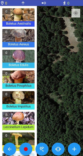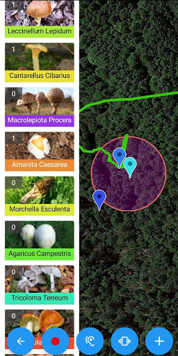 A simple click on the button and from the list we choose the mushroom found, a marker will be placed on the map in the current position, with the same color as the mushroom label.