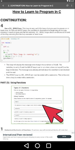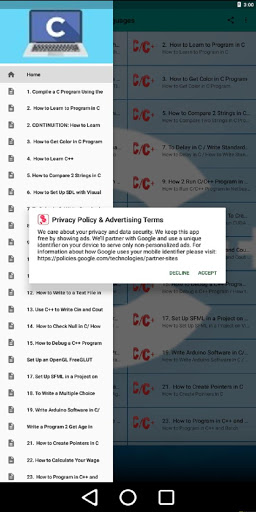 Matututunan mo ang lahat ng mga pangunahing kaalaman : Paano mag-organisa ng mga programa, mag-imbak at magpakita ng data, magtrabaho sa mga variable, mga operator, I / O, mga payo, arrays, function, at marami pang iba. C programming ay hindi kailanman naging simple ito!