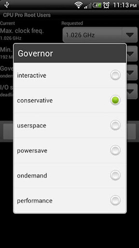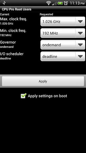 ROOT USERS ONLY YOU must be rooted in order to use this app. Thank youWant you to be able to change the CPU Frequencies on your device?Well now you can with CPU Pro for Root Users. Quickly choose which governor you want to use and set your min and max frequency. It39;s that simpleBe wary of the frequencies you select Your phone may lock or become unresponsive if it doesn39;t like extreme values. You agree to not hold the developer responsible if anything happens to your device.features Easy GUI to set frequencies, governor and io scheduler Small lightweight app size Performance driven Apply settings on boottags cpu pro root users, setcpu, cpu master antutu cpu cpu tuner tasker