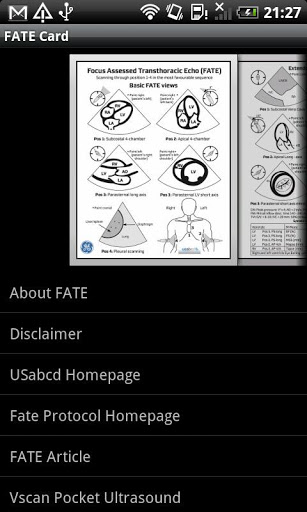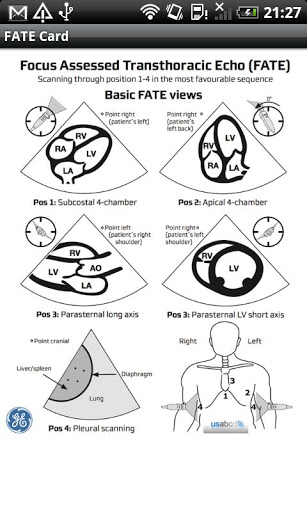 FATE is the original focused echocardiography protocol.FATE Focus Assessed Transthoracic Echocardiography is the original focused echocardiography protocol practiced since 1989 as a supplement to the clinical evaluation. FATE is easily and quickly learned and meets the basic echocardiographic needs for the noncardiologist in order to guide cardiopulmonary optimization in all relevant clinical scenarios and locations FATE can be performed in few seconds or extended to a more comprehensive echocardiographic examination depending on the clinical requirements.SD card permission is used if you choose to save a local PDF copy of the original FATE article.