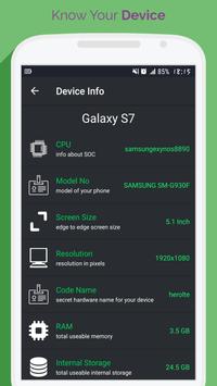 It also provide the details about your phone's Model, Screen Size, RAM, Internal Storage, Screen Resolution and Code Name and OS info. In short, all the key information of your device is just one touch away! Tap and get all you want!