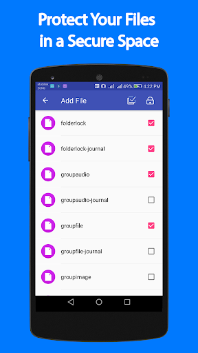 Hinahayaan ka ng Folder at File Locker na protektahan ang iyong mahahalagang larawan, video, audio, dokumento at iba pang mga file sa android phone gamit ang password / pattern lock. Ang Folder at File Locker ay ang pinakamadali at pinakaligtas na paraan upang lumikha ng isang ligtas na lokasyon upang mag-imbak ng personal na data at protektahan ang iyong privacy. I-import ang iyong mga sensitibo at hindi malilimutang larawan sa iyong personal na gallery upang matiyak na ang mga kaibigan na gumagamit ng iyong telepono ay hindi nakikita ang iyong mga personal na larawan at video. I-lock ang iyong pribadong dokumento at folder upang ihinto ang mga paningin sa paningin. Pinipigilan ng Folder at File Locker ang iba pa mula sa pagtuklas ng iyong kumpidensyal na mga file. Maaari mong i-lock ang anumang uri ng file at folder na ito ay mabilis at maaasahan.