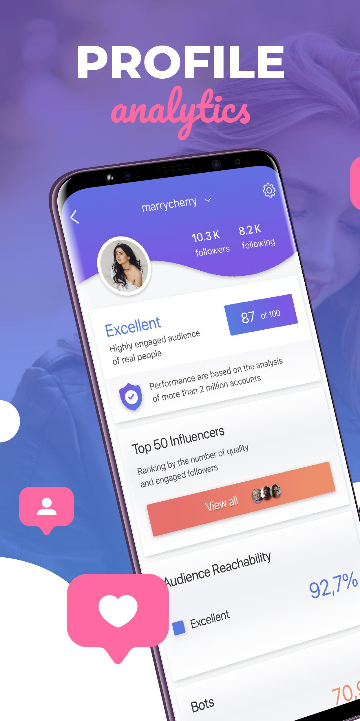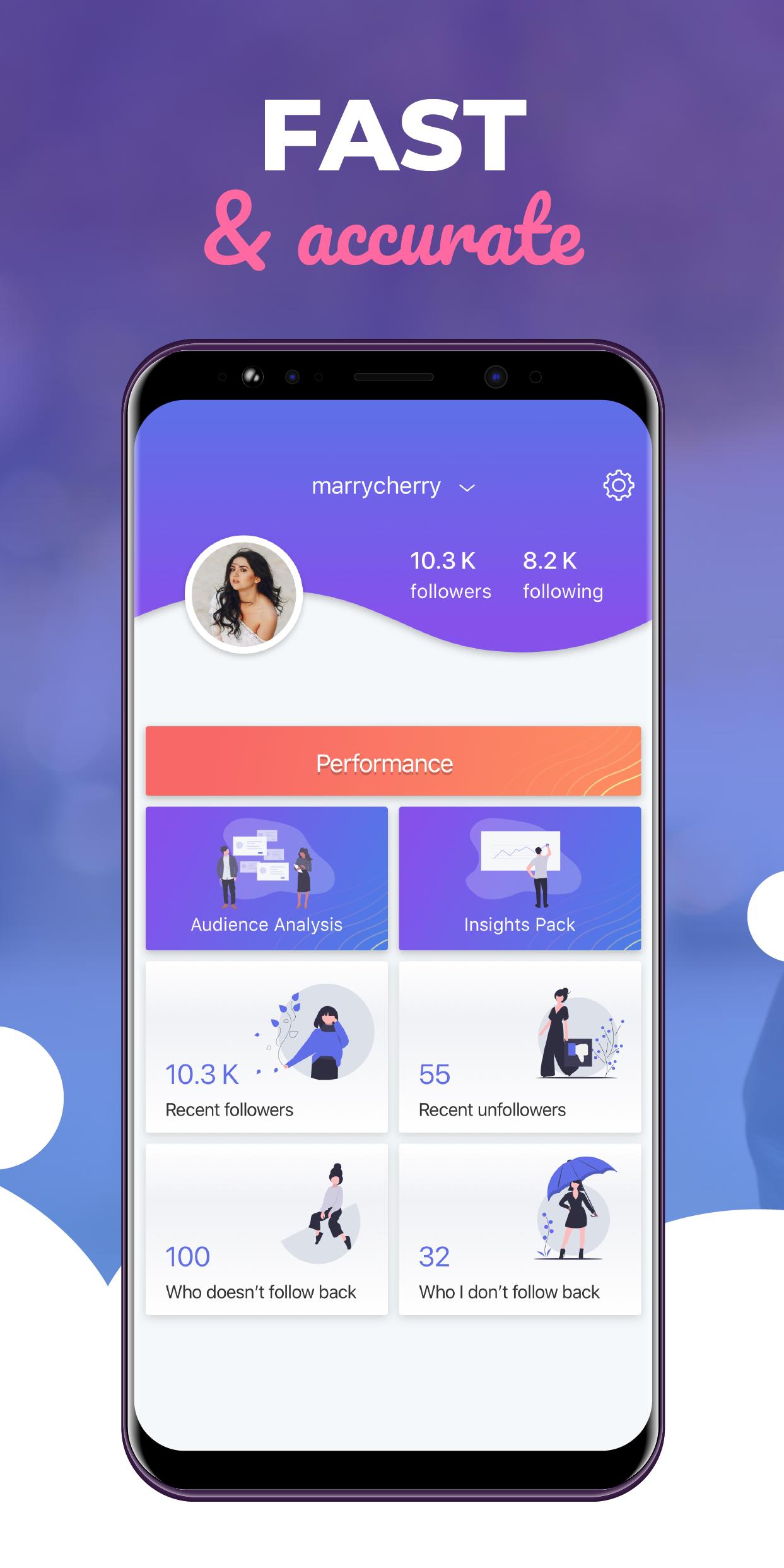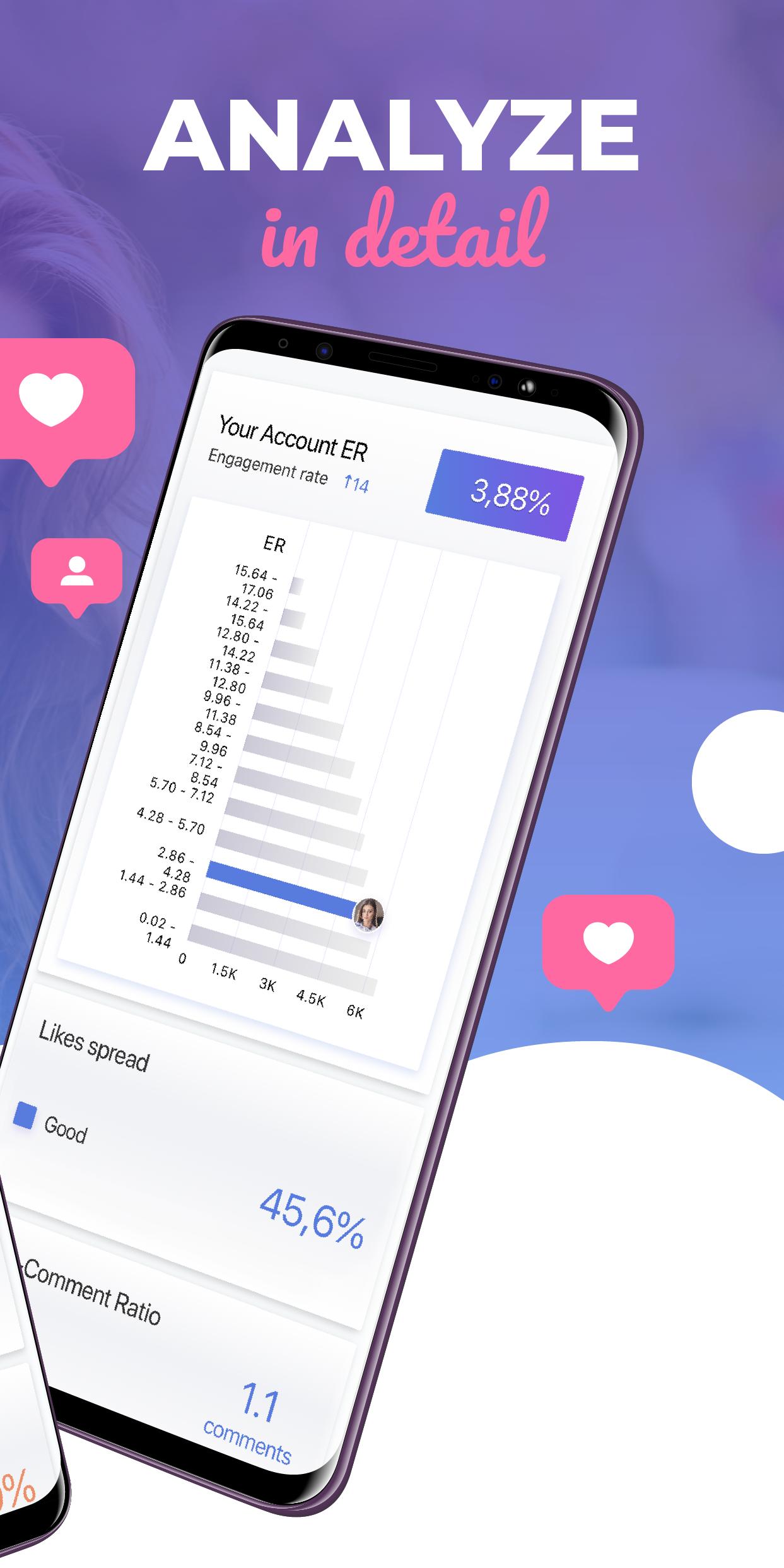 All analytics in one app. Get detailed reports, analyze and improve your profile. Follow & delete other people in just one click. Track popular publications and create amazing content that your followers will love. Find out who your best likers are!