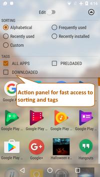 - Action panel in app drawer allows easy access to sorting and tag selection. You can create custom tags from app drawer settings.
