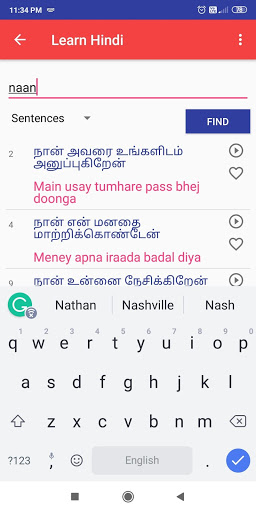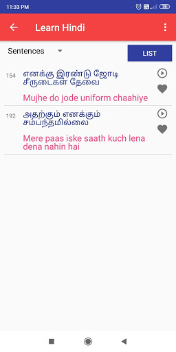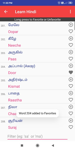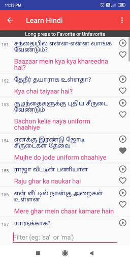 Tinutulungan ka ng app na ito na matuto nang pasalitang Hindi sa pamamagitan ng Tamil nang hindi na kailangang matuto ng mga hindi mga titik.Mayroon itong 600 Hindi salita at 350 araw-araw na ginamit Hindi Mga pangungusap na may audio, upang matagumpay mong matutunan ang Hindi sa iyong sarili sa pamamagitan ng pag-download ng app na ito.