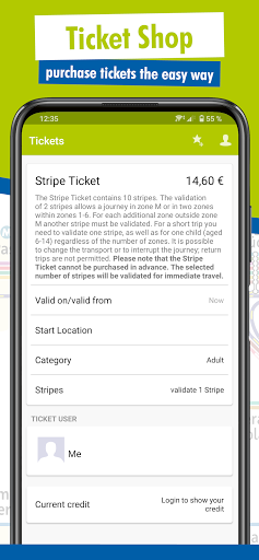 • Mga tiket: Sa menu item na "Mga tiket" maaari kang bumili ng mga napiling mvv ticket bilang mobile ticket. Magrehistro isang beses sa loob ng isa sa mga nakalistang tindahan (magkatulad na hanay ng mga tiket) at piliin ang iyong tiket bago simulan ang iyong paglalakbay. Maaari kang magbayad para sa iyong mga tiket sa pamamagitan ng paggamit ng credit card o direct debit. Tulad ng mga electronic ticket ay personalized, kailangan mong dalhin ang iyong opisyal na photo ID.