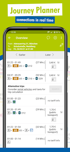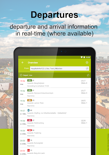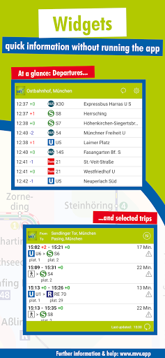 Nagbibigay ito ng impormasyon sa paglalakbay para sa buong network ng pampublikong transportasyon sa Munich at sa mga nakapalibot na rehiyon (mga distrito ng Dachau, Ebersberg, Erding, Freising, Fürstenfeldbruck, München, Starnberg at ang Norhern bahagi ng Bad Tölz-Wolfratshausen) - Hindi Matter kung pupunta ka sa tren, (sub) urban railway, underground, tram o bus. Sa maraming mga kaso na may real-time na impormasyon. Gamit ang MVV-app maaari ka ring bumili ng mga napiling mvv ticket sa iyong smartphone o tablet on the go. Magrehistro ng isang beses at mayroon kang pagpipilian upang bumili ng solong trip ticket o maaari mong piliin na bumili ng isa sa aming mga tiket sa araw para sa iyong pamamalagi sa Munich. Bukod, ang MVV-app ay nagbibigay ng karagdagang impormasyon sa pampublikong transportasyon sa buong mas malaking lugar ng Munich, tulad ng pampublikong transportasyon at taripa ng mga mapa pati na rin ang anumang mga pagbabago sa mga timetable.
