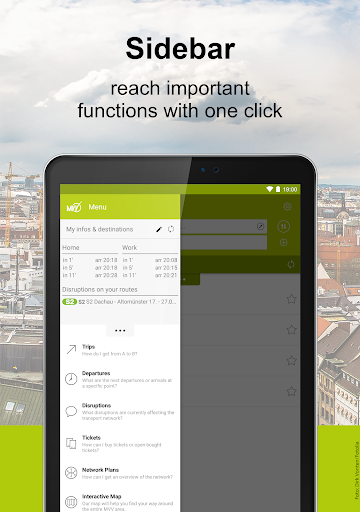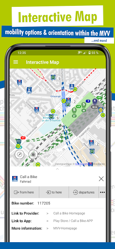 • Interactive Mapa: Ang interactive na mapa ay hindi lamang nakatutulong sa iyo na sumama sa lugar ng MVV. Makakakuha ka ng access sa karagdagang impormasyon tulad ng mga kalapit na pag-alis sa pamamagitan ng paggamit ng iyong GPS signal halimbawa.